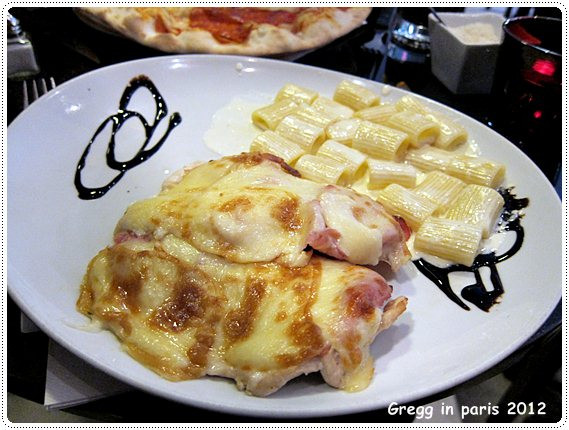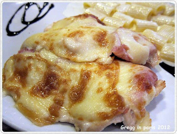 兩大塊的焗烤雞肉,中層還夾了火腿